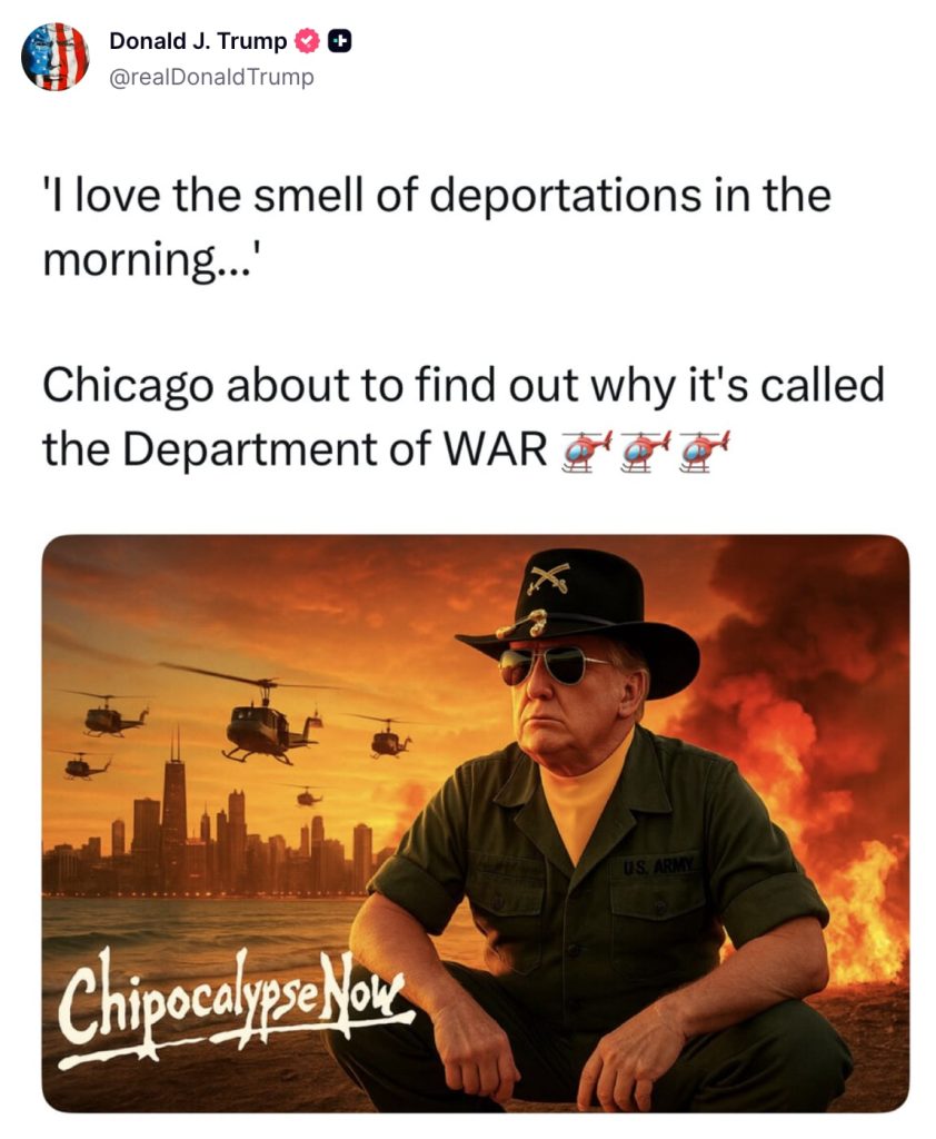 The message echoed the iconic opening scene of Coppola’s war film, featuring Robert Duvall as Colonel Bill Kilgore with helicopters flying behind him. Trump’s doctored image carried the caption: “Apocalypse Shitcago.”